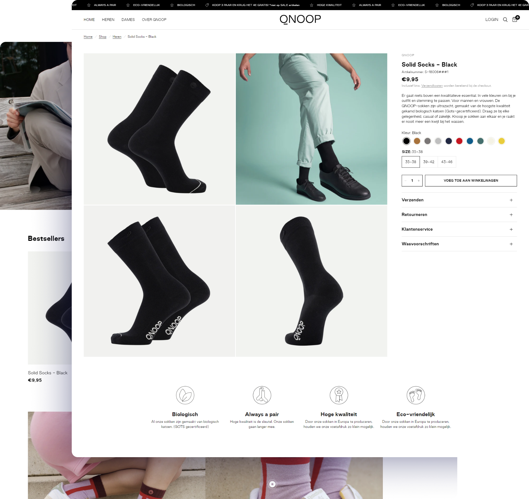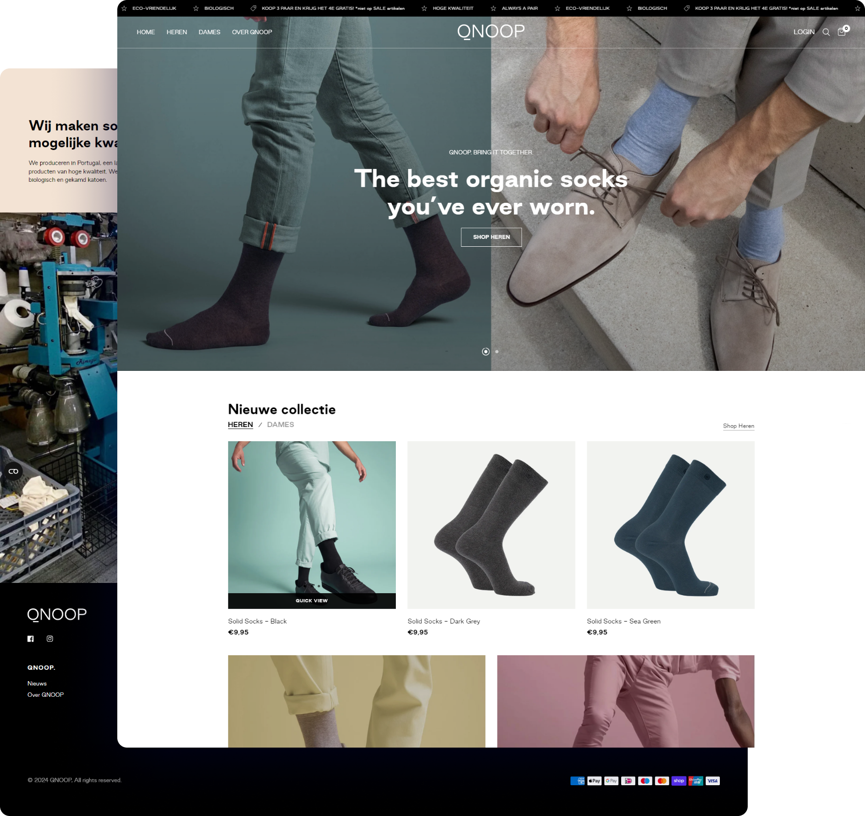 Voor de ontwikkeling van de nieuwe webshop in Shopify zijn we begonnen met een kick-off, waarin het design centraal stond. Samen met Qnoop hebben we besloten om een minimalistisch thema te kiezen dat gebaseerd is op het ontwerp van de vorige webshop. De navigatie is overzichtelijk gehouden volgens het principe ‘less is more’. Ook is er in het design een sterke focus op hoogwaardige fotografie. Dit resulteerde in een moderne, schone look die de premium kwaliteit van de sokken van Qnoop benadrukt.
