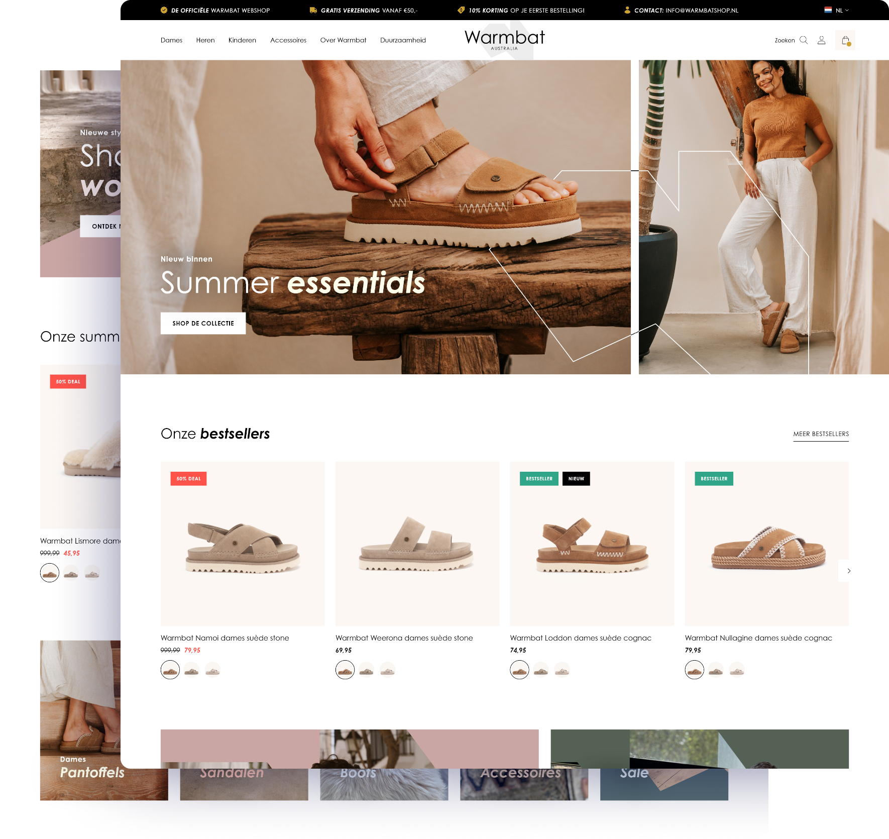 Het design van de nieuwe webshop is volledig afgestemd op de identiteit van Warmbat. We kozen voor een clean en modern ontwerp, met zachte kleuren, ronde vormen en rustige fotografie. Deze combinatie zorgt voor een uitnodigende en herkenbare uitstraling die aansluit bij het karakter van het merk. Het logo en beeldmerk komen op subtiele wijze terug in verschillende banners en visuele details, waardoor de webshop consistent en vertrouwd aanvoelt. Zo ontstaat een digitale omgeving die de warmte en kwaliteit van Warmbat op een natuurlijke manier overbrengt.
